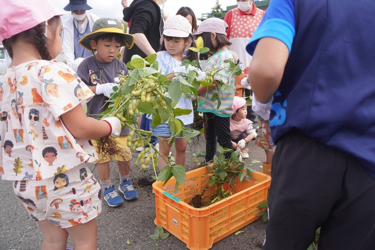 朝は強い雨が降りましたが午後にはすっかり晴れて、畑作業にはぴったりの天気に。子どもたちは軍手をしっかりはいて、枝豆の収穫に挑戦しました。年少さんは職員が抜いておいた株からサヤをちぎり、年長さんは土から株を引っこ抜くところから体験。あっという間に、籠いっぱいの枝豆が集まりました。