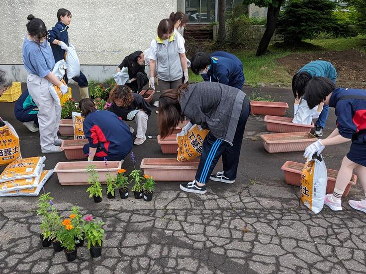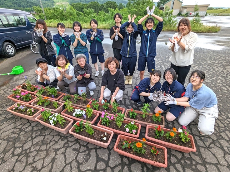 プランター植えの作業ボランティアを、地元の皆さんに事前に呼びかけたところ、一般の方5名、地元の北海道おといねっぷ美術工芸高等学校の生徒さんたち9名、計14名の皆さんが参加してくれました!