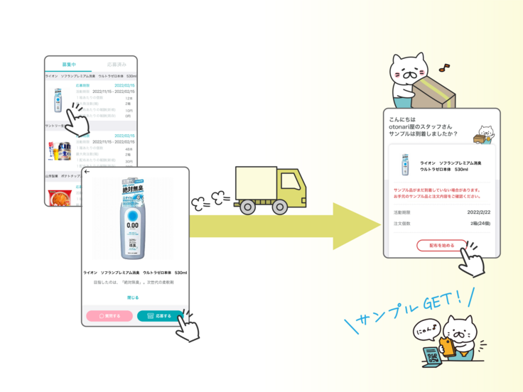 otonariの基本的な機能です。各メーカー様が提供するサンプル品が、otonariアプリ内で表示されますので、ご自身の店舗で配りたいものを選択し、ご応募していただきます。