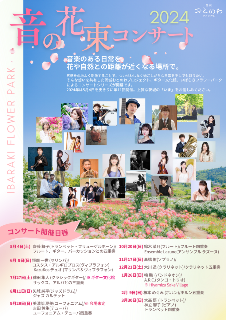 上のフライヤーはいばらきフラワーパークさまとともに企画する通年のコンサートシリーズ「音の花束コンサート」。