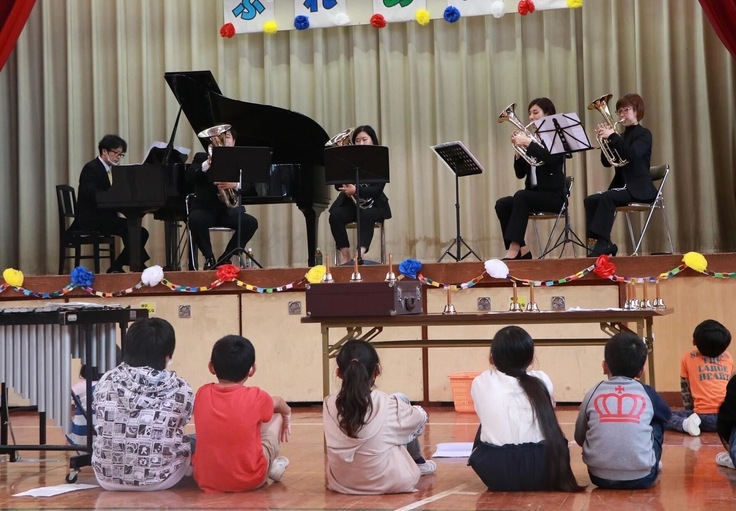 音楽鑑賞教室のほか、全校児童と演奏者が一緒に練習を行い1つのコンサートを作り上げるワークショップを行いました。