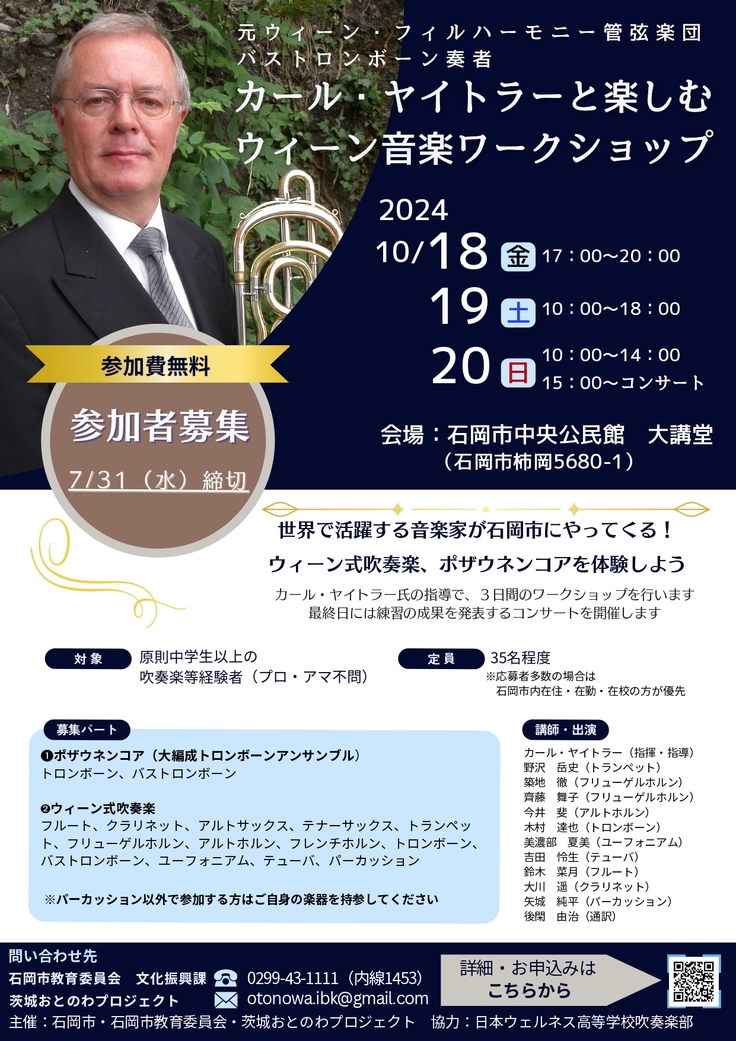 さらに、2024年7月にはザルツブルク・モーツァルテウム管弦楽団 主席クラリネット奏者 フェルディナント・シュタイナーさんを、10月には元ウィーン・フィルハーモニー管弦楽団 バストロンボーン奏者 カール・ヤイトラーさんをお迎えして、吹奏楽部の皆さんが演奏でも参加できるコンサートとワークショップを開催いたします。