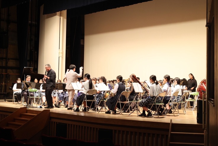 また、第2部はゲストステージとして、近隣の中学校吹奏楽部の皆さんに演奏していただき、最後は当日の出演者全員がステージに集合して「学園天国」を演奏。