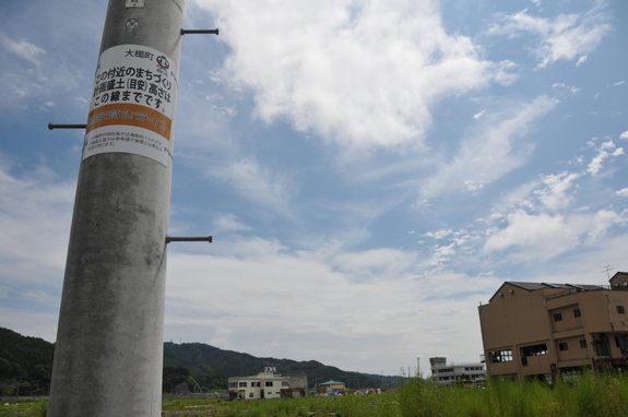 津波でお墓や本堂が流された江岸寺そばの電柱に「この付近のまちづくり計画盛土(目安)の高さはこの線までです」との表示を見つけました。