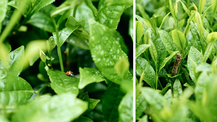 2つ目は、茶畑の生態系の豊かさです。大塚園さんの畑では、茶木の間をかき分けると、バッタやてんとう虫が跳ねたり、鳥が巣を作って卵を育てたりしている光景が見られます。有機農法への切り替えで、昆虫や動物が急に増えたそうです。環境省が掲げる「ネイチャーポジティブ(自然再興)」の理念にも共感しており、農園の取り組みが生態系の豊かさに繋がっていることを実感しました。なお、製造工程で昆虫はきちんと除去されていますのでご安心ください。