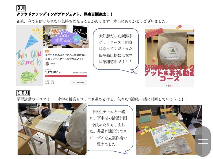 *2021年6月1日開業。当初は新潟市内のレンタルスペースを転々としながら、子どもたちにマンツーマンの個別学習支援やコミュニケーションのコーチングを教えて回る。 *2021年11月13日、ようやく定住の地、現在の教室を構える。同年12月1日に新教室にて学習支援開始。 *2022年9月24日、READYFOR様にてクラウドファンディングプロジェクトを達成!!本当にたくさんの方々にご支援いただき、教室運営の継続に大きなお力添えをいただいた。 *2022年12月1日、ついに1周年を迎える!! *2023年3月現在、13名の子どもたちと一緒に自由な学びやでワイワイ楽しく学習を続けている。スタッフ3名を迎え、自分らしく学ぶ子どもたちの日常を日々守るべく奔走中!!