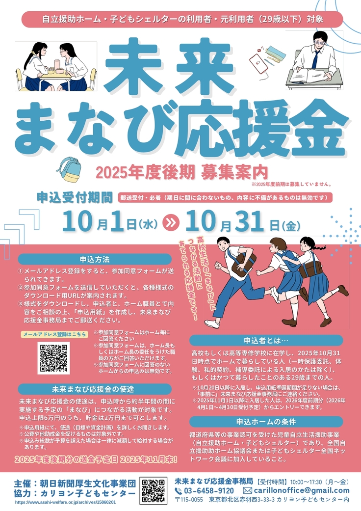 「こども応援金」プロジェクトに寄せていただいたご支援を役立てる「未来まなび応援金」(以下、まなび応援金)の申し込み受け付けが10月1日(木)から始まりました。