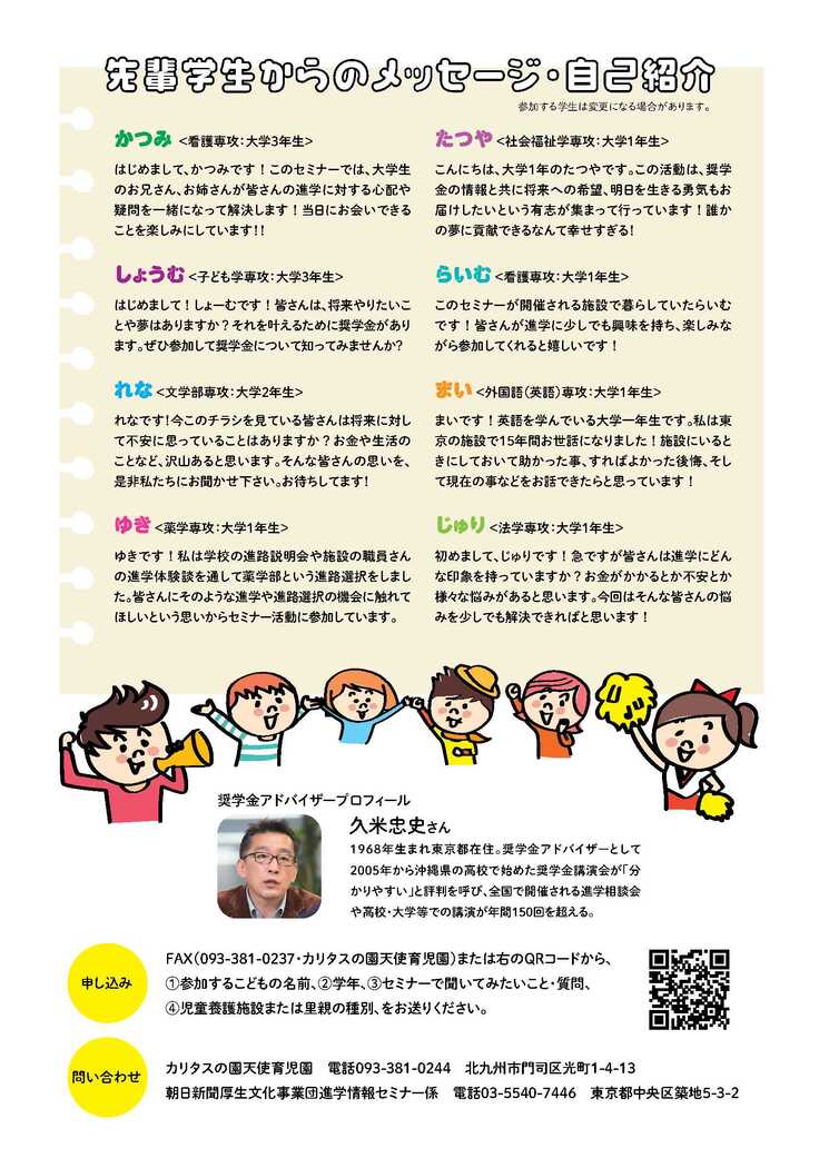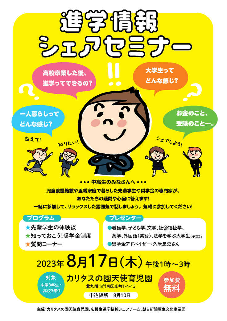 児童養護施設や里親家庭で過ごした応援生が、同じ立場の後輩や児童養護施設の職員さん、里親さんなどに進学情報や体験談を話すセミナーを、8月17日、北九州市のカリタスの園天使育児園で開きました。