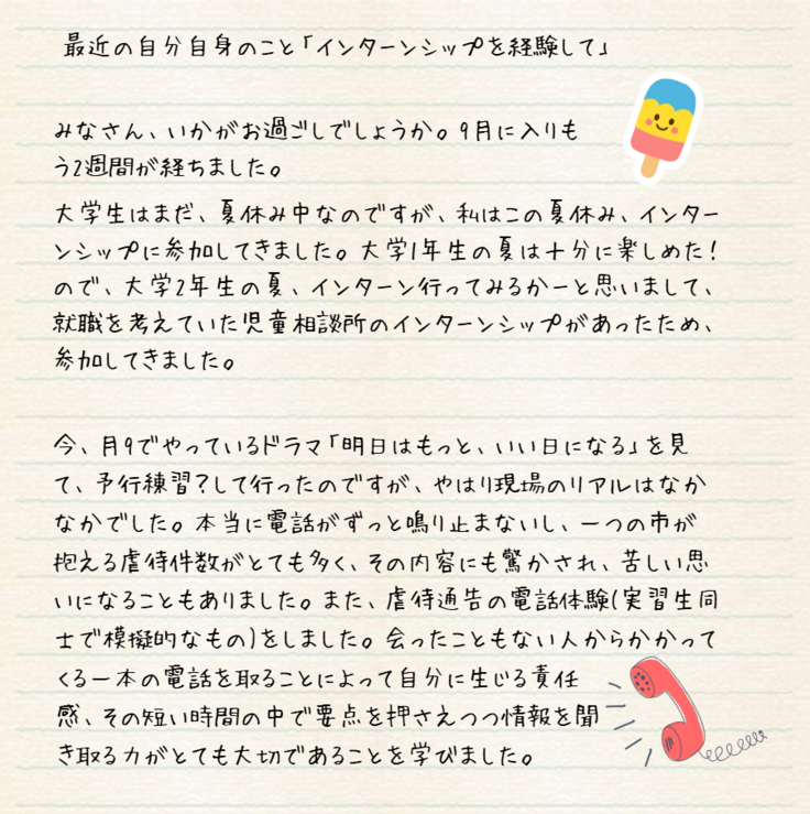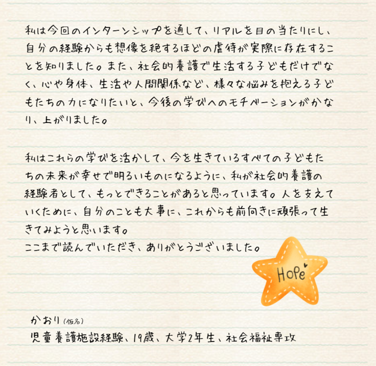 本日の活動報告では、こども応援金の給付型奨学金を受けて、大学で学ぶ学生の声を紹介します。