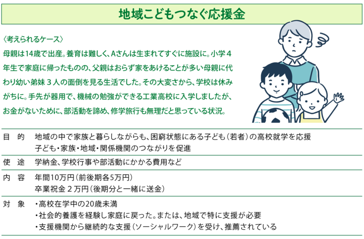 新設する地域こどもつなぐ応援金は、個人からの申し込みではなく、児童家庭支援センター*¹や社会的養護自立支援拠点事業所*²などの地域の支援機関*³を通じて申し込みを受け付けます。継続的な伴走支援と奨学金がセットになってこそ、「つながり」を生む、より良い支援になると考えての仕組みです。