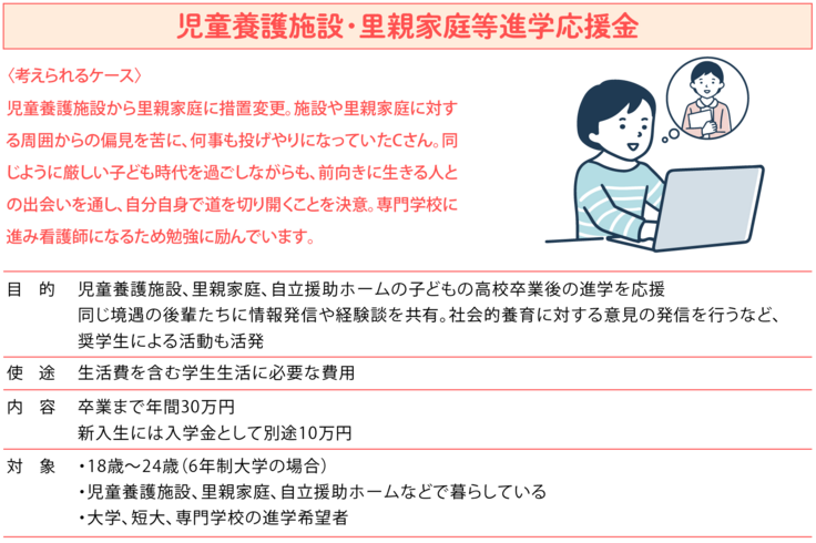 児童養護施設・里親家庭等進学応援金は、給付型奨学金(返済不要)です。