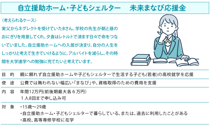 B:自立援助ホーム・子どもシェルターまなび応援金を指定