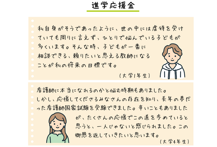 当事業団では、2008年に社会的養護出身の子どもたちのための児童養護施設・里親家庭等進学応援金(給付型奨学金、以下、進学応援金)を開始しました。当時、民間団体や自治体などによる返済不要の奨学金制度はわずかでした。
