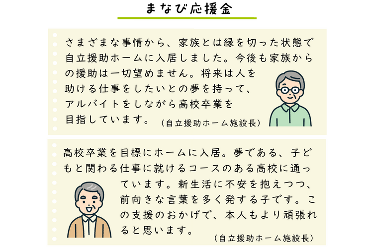 支援金は、すべてを応援金として児童養護施設、里親家庭、自立援助ホーム、子どもシェルターの子どもや若者、地域こどもつなぐ応援金の申込者に送ります。 送金予定金額は、合計5620万円です。 ①地域こどもつなぐ応援金:総額1620万円(概算・予定)。当事業団が指定する専門機関を通じて申し込みのあったおよそ300人の子どもに年間10万円および、対象者には卒業祝い金として一時金2万円を支給。②児童養護施設・里親家庭等進学応援金:対象となる応援生62人に総額2200万円を支給(申し込み年次により金額が異なる)③未来まなび応援金:高校在学中の学用品(公費が充てられるものは除く)購入費や部活動の遠征費、資格取得のための資金として、約300人に6万円(半年ごと)を給付。総額1800万円(概算・予定)