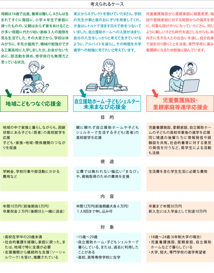 朝日新聞厚生文化事業団は、虐待をはじめ様々な困難を経験し、児童養護施設や里親家庭、自立援助ホームなどで暮らす子どもたちのための2つの給付型奨学金に加え、今年度から新たな奨学金をスタートさせます。