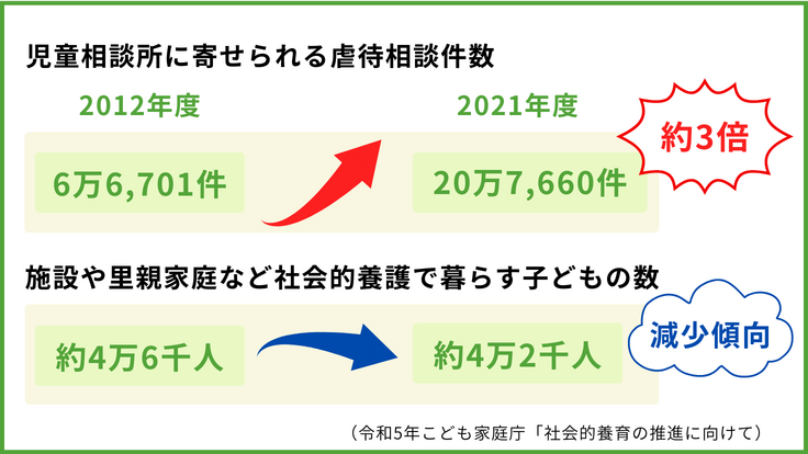 児童相談所に寄せられる虐待相談件数は20万7660件(2021年度)。10年前の2012年度と比較すると約3倍です(こども家庭庁による)。