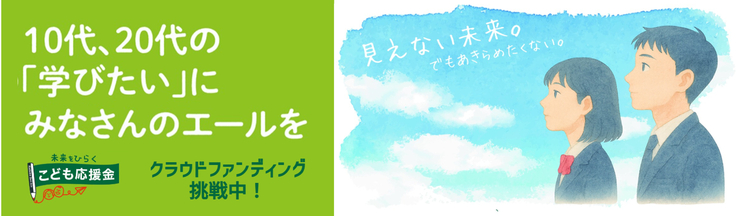 見えない困難に阻まれ、学びたくても学べない子ども、若者を支えるための「こども応援金」。ぜひ、ご支援をお願いいたします。本日23時59分まで。