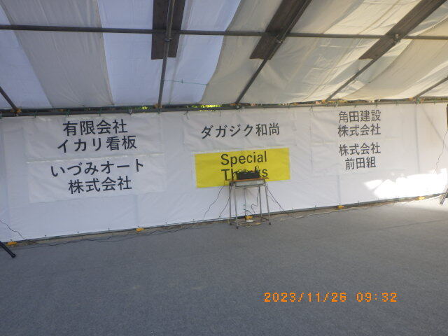 おかげさまで、立派な屋根付きのステージの設営ができました。