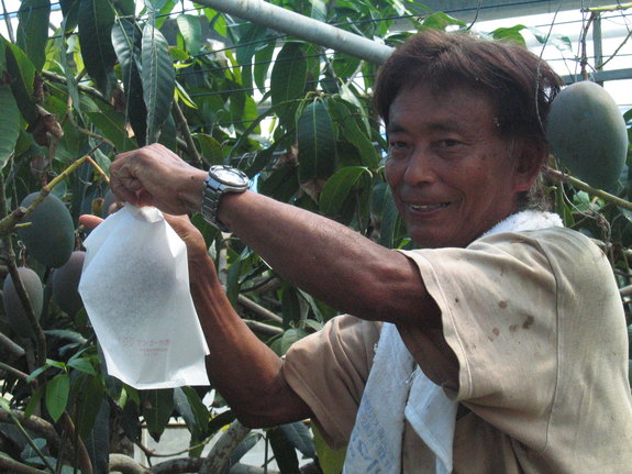 マンゴー農家さんは、マンゴーひとつにひとつに日焼け防止のために袋がけの真っ最中でした。