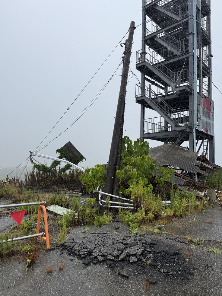 津波被害で破損してしまった津波タワー。また隆起とは逆に地盤沈下により高潮で冠水してしまう所も出てしまいました