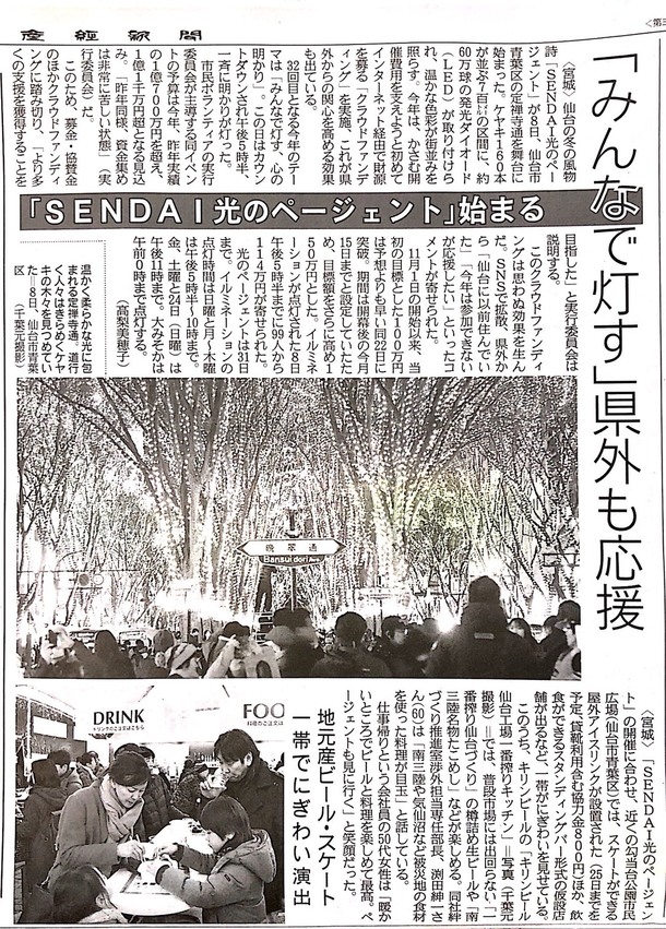 先日12月8日に開催しましたSENDAI光のページェント点灯式の内容とクラウドファンデングの案内が産経新聞に掲載されました。引き続きご支援よろしくお願いいたします。