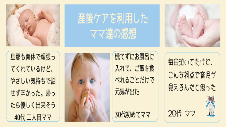 産後ケア事業とは、家庭の支援が十分に受けられない母親と子どもを対象に1歳未満の期間を対象に、休息や、育児不安の解消などニー