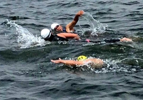 (中海オープンウォータースイムの写真です。ガイドさんと泳いでいます)