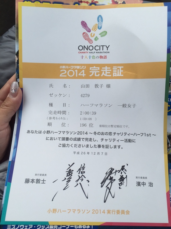 ・日曜:第1回小野ハーフマラソンに参加、高低差102m・8km超えてからアップダウンが続く難コースでしたが、前日の練習疲れも吹き飛ばして、2時間を切ることができました!(ネットタイム/1:59:08)