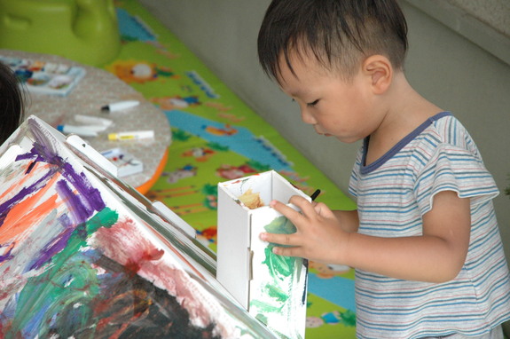 (3歳児 イベントの様子 段ボールでできたおうちをみんなで塗り上げよう♪)