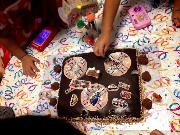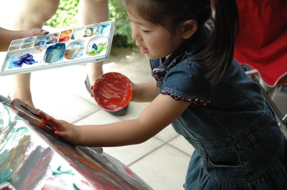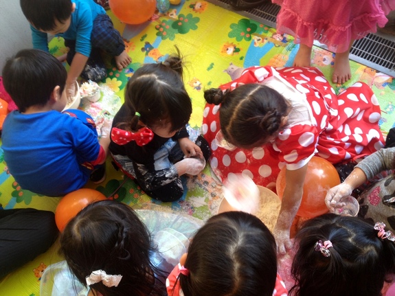 (現地校の幼稚園でのバースデーパーティーの様子。斬新な右後ろの作品は、みんなで塗り上げたもの)