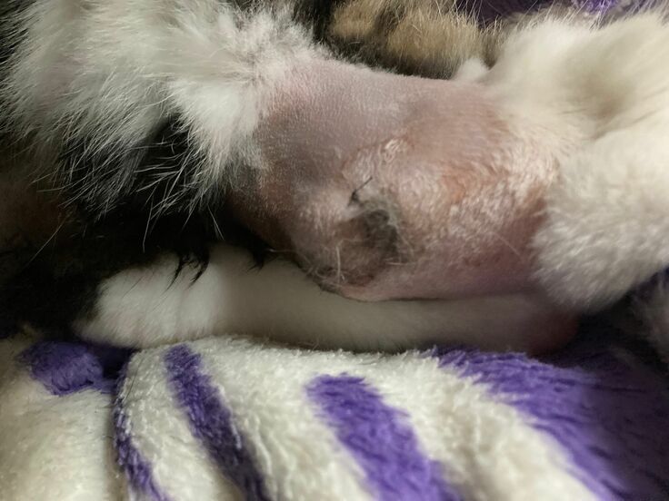 ▼踵の膨れている部分です。(医師による剃毛、検査部分の一部摘出後)