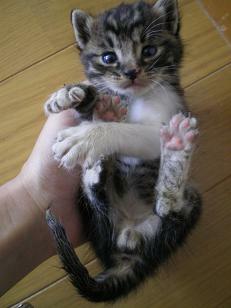 お宅にうかがって人間同士で話し込んでいたら、テーブルの下からうなり声がしました。子猫(当時2ヶ月半くらい)のピーちゃんがわたしが持って行ったおもちゃをくわえて「これはボクのだ!」とばかりに他の子を牽制していたのです。ご夫婦は「いつもは一番おとなしい気弱な子なのに」とびっくりしていました。