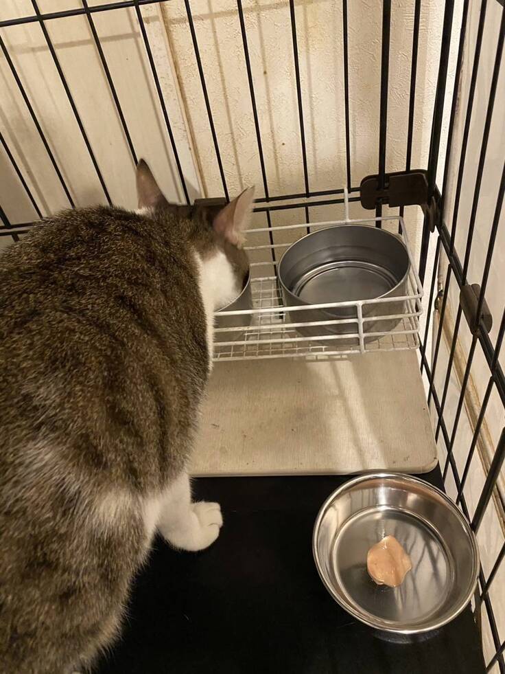 がっちゃんは、カリカリを爪研ぎまで運んで食べるのがマイブームです。