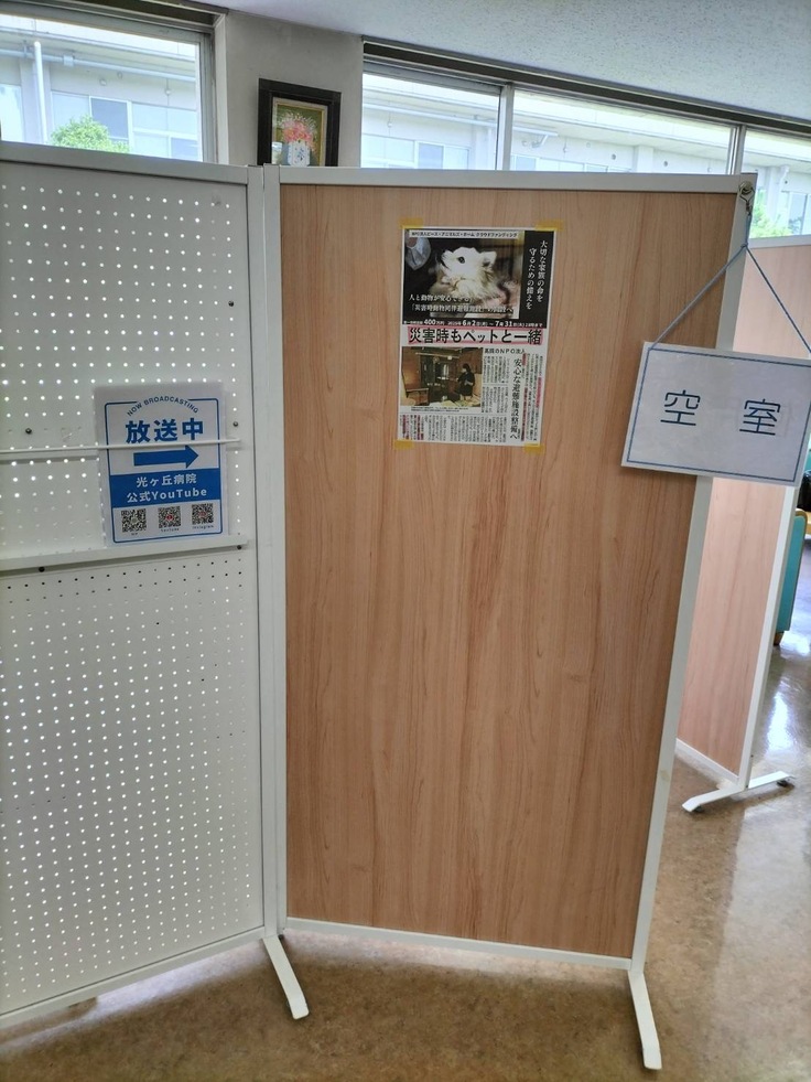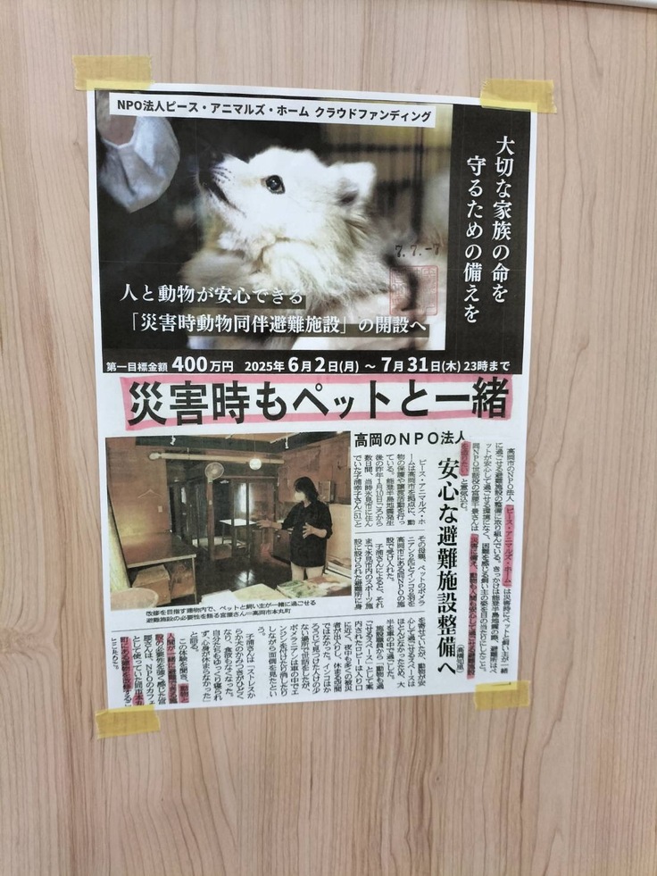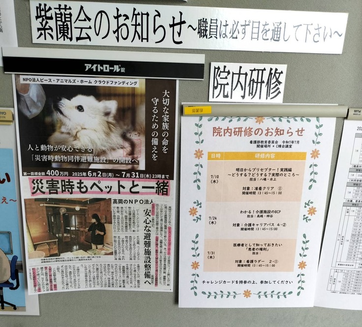 当団体の能町施設で犬たちのお世話をくださるボランティアさんが、ご勤務なさる病院の職員の方々が御覧になる掲示板にクラウドファンディング挑戦のチラシと先日、北日本新聞に掲載された当団体の災害時動物同伴避難施設の記事を掲示くださいました!お気持ちが嬉しくて感激して胸がいっぱいになりました。本当にありがとうございます。まだ目標の半分にも到達していませんが、応援くださるかたのためにも動物たちのためにも絶対達成します!精一杯頑張ります!