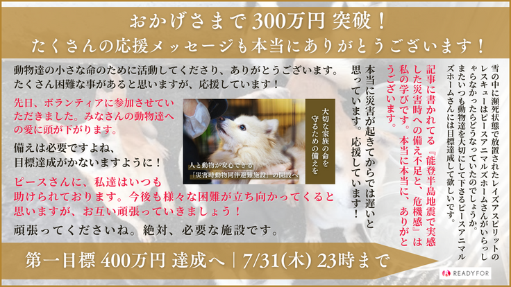 【おかげさまで300万円突破】本日最終日!あと100万円です!