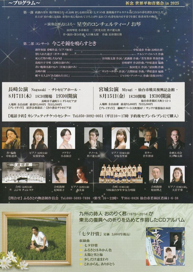 今年は終戦および原爆投下から80年の節目。平和の尊さを強く、深く思い起こす音楽会を被爆地長崎で開催したい。そう思い立ち、昨秋から企画を練り始めましたところ願いが天に通じたのか、長崎の皆様から思いもよらぬ協力を得ることができ、急展開で音楽会実現の運びとなりました。目に見えぬ不思議な力が働いているような気がしています。