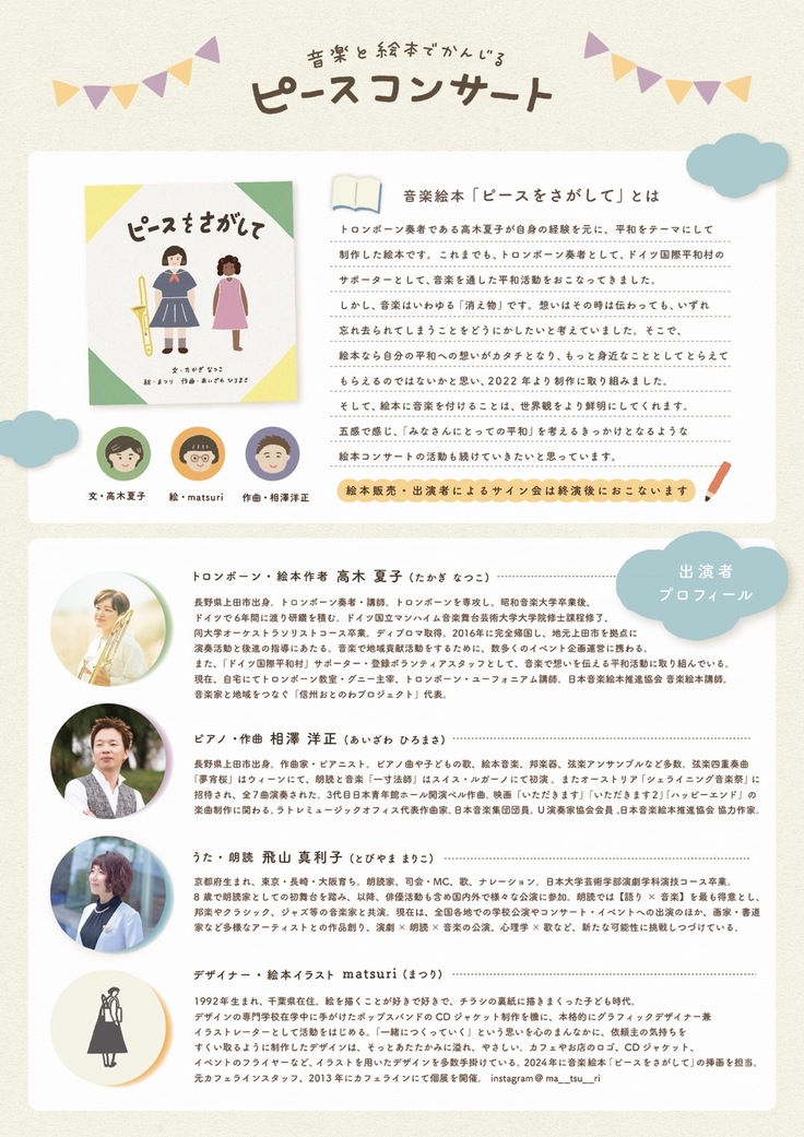 作者・高木夏子、絵・matsuri、作曲・相澤洋正の3人に加え、朗読家の飛山真利子を加えた4人でお届けする特別なコンサートです。