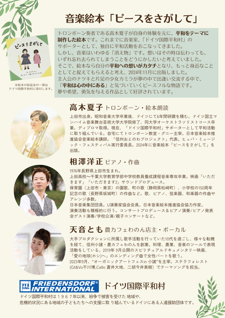 私、トロンボーン奏者・高木夏子が平和への想いを込めた音楽絵本「ピースをさがして」をメインに平和をテーマにしたコンサートをさせていただく運びとなりました。