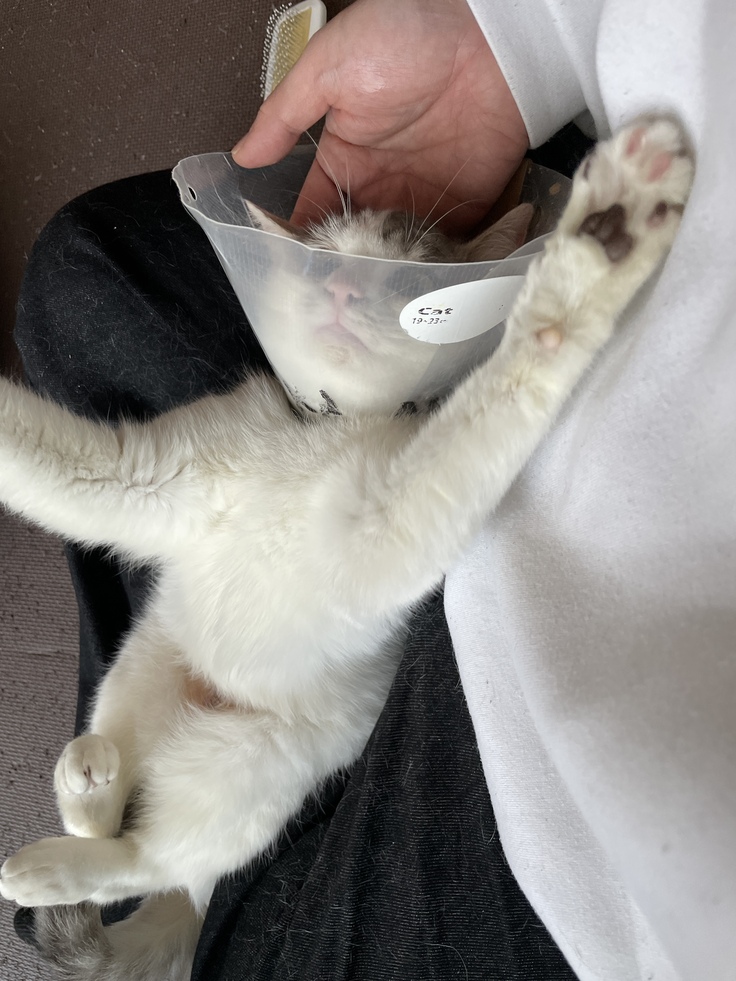 大手術といっても、普段より大きく開いてちょちょっと処置する程度ですが、その分傷口も若干大きく抜糸が必要な縫合になるとのことで、エリザベスカーラーを装着することに。