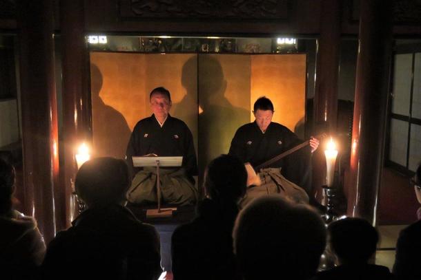蝋燭の仄かな灯りの中、荻江節、「金谷丹前」「鐘の岬」をお楽しみいただきました。