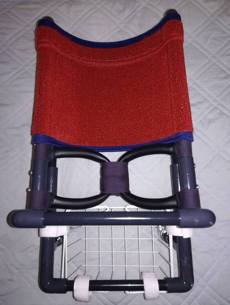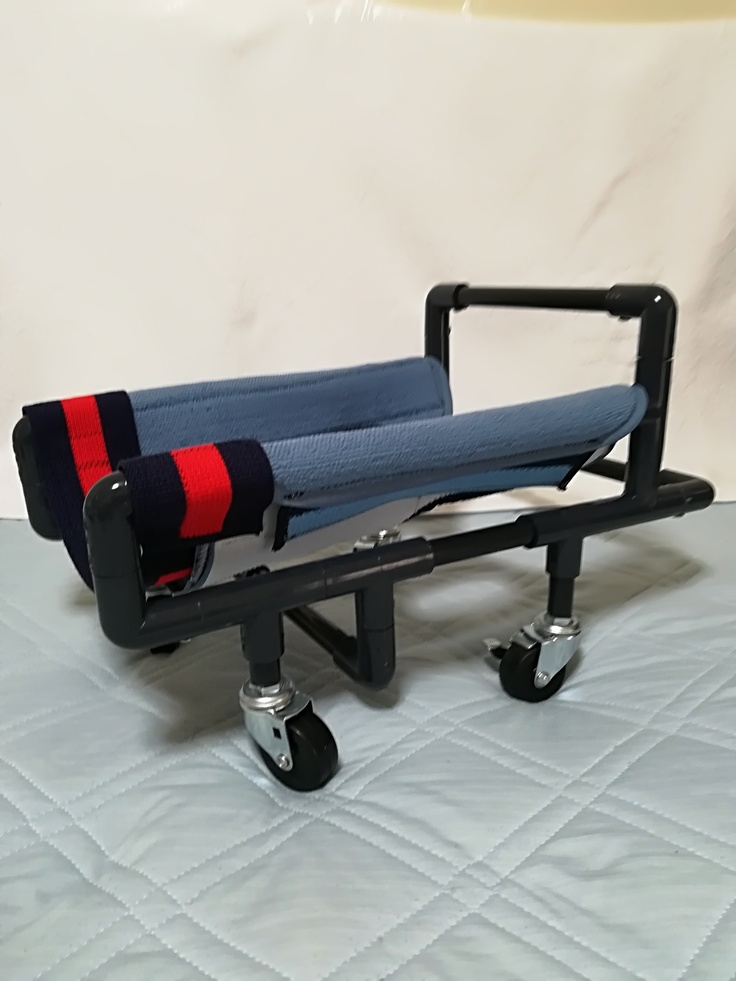 試作を創り改良を繰り返し1台の車椅子「歩行器」が出来、乗せることが出来ました。