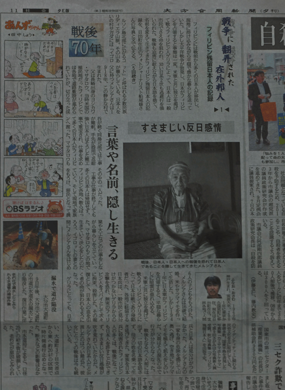 大分合同新聞の戦後70年企画の一環として、「フィリピン残留日本人」についての記事を執筆させていただきました。「戦争に翻弄された在外邦人」というタイトルで、今日の夕刊から5回連続の掲載となります。大分合同新聞のウエブサイトでも無料で見ることができます。