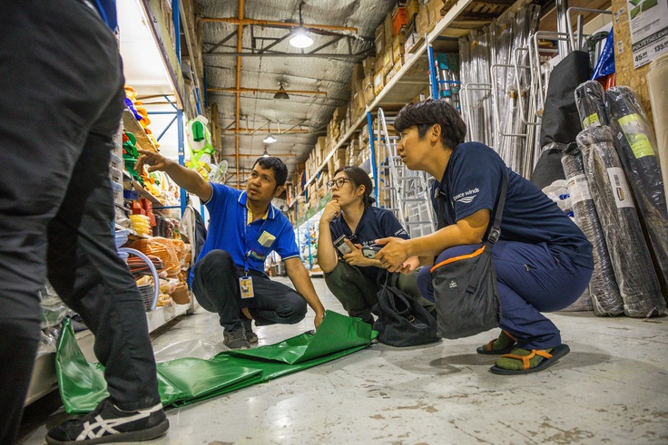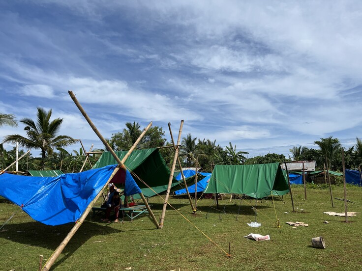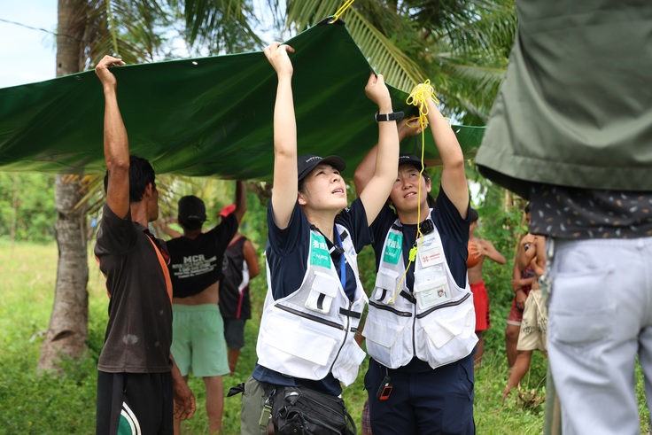 物資を届けると被災者たちが自ら手際よくテントを補強したりタープを張ったりしていきます。ひとつのテントを複数の家族でシェアしたり、雨が降れば雨漏りしたり、テントやタープの外にあったものを急いでテント内にしまわなければならない状況でしたが、雨をしのげる空間が少しでも広がることで、こうしたストレスを少なからず解消できるといいます。
