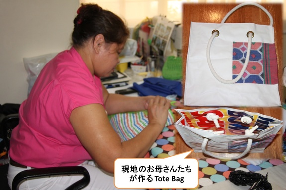 (現地で、手作りのバックを製作しているお母さんと、Tote Bagの見本)