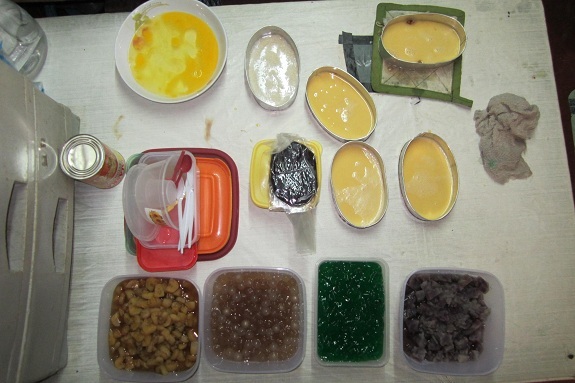 ナタデココ、カオン、バナナ、ジャックフルーツ、コーン、ウベ、プリン、ミルクなどで6.7ペソ。