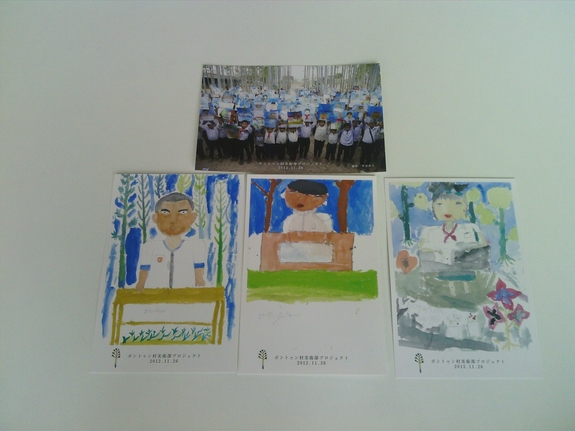 ポストカードは、実際に子どもたちが描いた絵を使用して作成したものが3枚とポントゥン村美術部プロジェクトの全体写真を使用したものが1枚の合計4枚がセットになっています。約250枚もの子どもたちの絵の中から日比野氏が選んでくださった選ばれた絵を使用して作成しております。