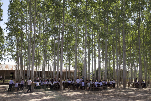 ポントゥン村の小学校には、すてきな林があります。あまりにきれいなので、日比野先生から「外で絵を描きましょう」という提案で、机や椅子を運び出し、林の中でワークショップを行いました。木のおかげで日差しも遮られ、最高の場所でした。