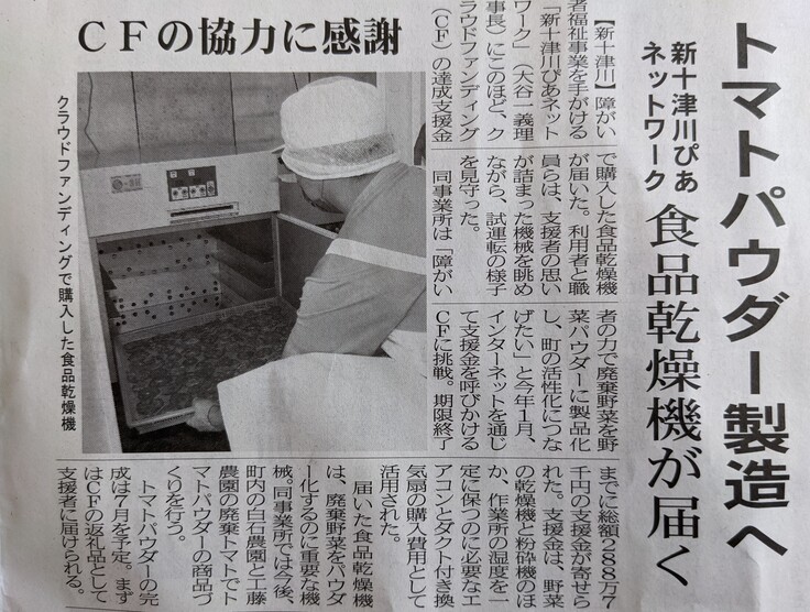 今年は、ご支援いただいた資金をもとに製品化を目指した活動をしていき、トマトだけでなく様々な乾燥野菜やパウダーづくりの試作を試みます。翌年からは、販路拡大を目指し、廃棄野菜の商品化とともに、障がい者の働く場としても拡充していきたいと考えています。