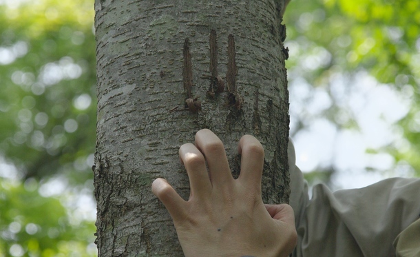 ウワミズザクラに残されたツキノワグマの爪跡を観察したり、