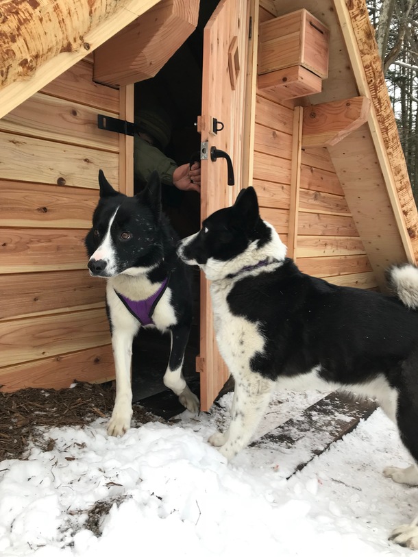 リオとニルスさんが軽井沢に到着して2日目。出産と小犬たちのために準備した小屋の前で、記念撮影をしました。